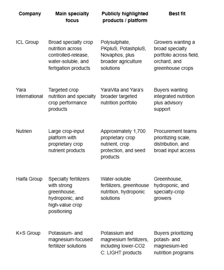 Comparison Table of Best Specialty Fertilizer Companies for Sustainable Agriculture