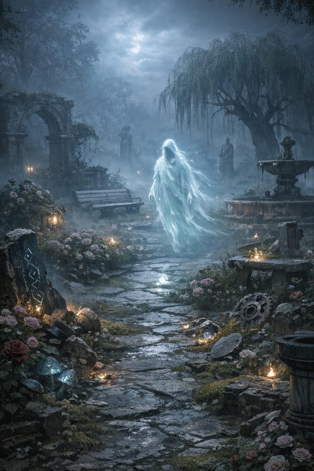The ghost moved with a slow, deliberate grace, searching for something it had lost centuries ago. Sometimes it paused beside a rosebush and tilted its head, listening. Sometimes it reached toward a stone bench, fingers trembling with recognition or regret.
