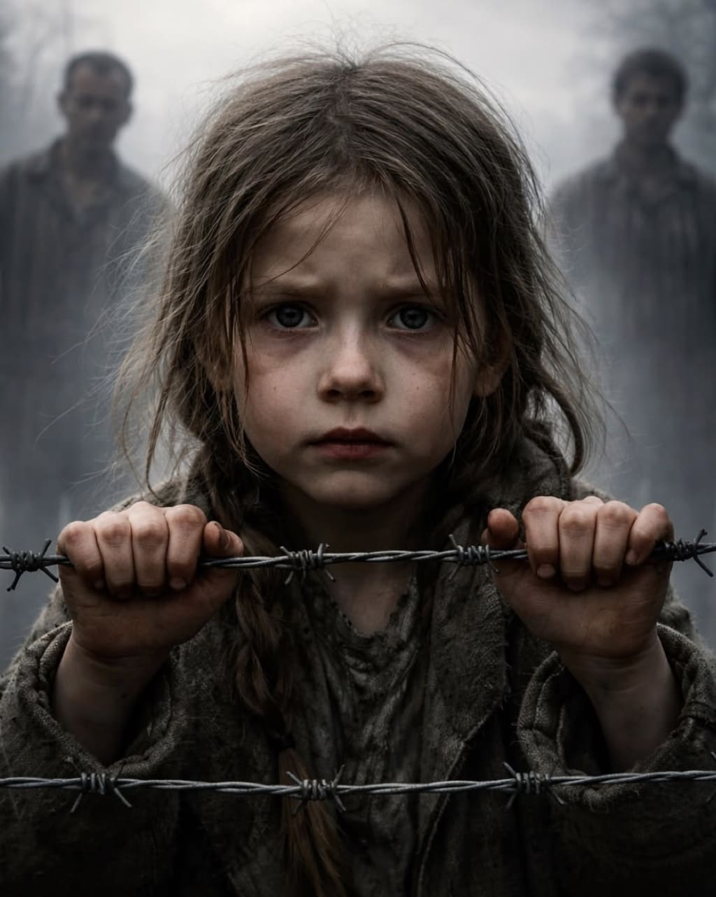 Her small hands grip the wire.